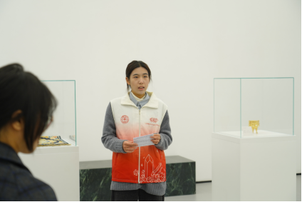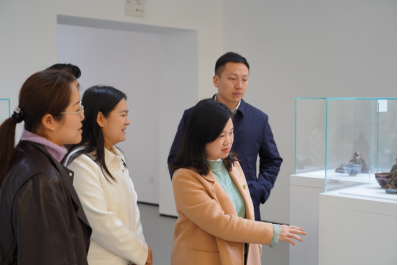 实践学习环节,6名志愿者讲解员带领全体老师同学围绕玉雕、掐丝珐琅、花丝镶嵌、建盏烧制、金镶玉、宫毯织造等各类非遗作品进行参观。志愿者讲解员详细且生动地介绍其工艺技法、历史渊源与文化寓意,让师生在沉浸式体验中深度感受非遗文化的独特魅力。