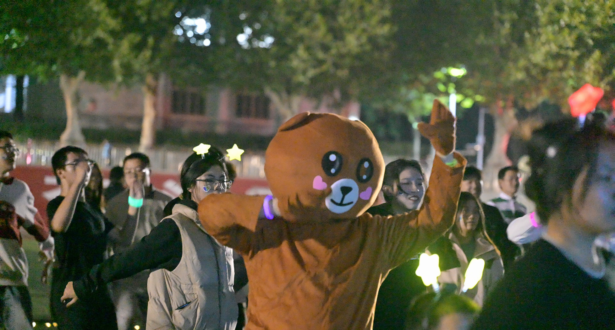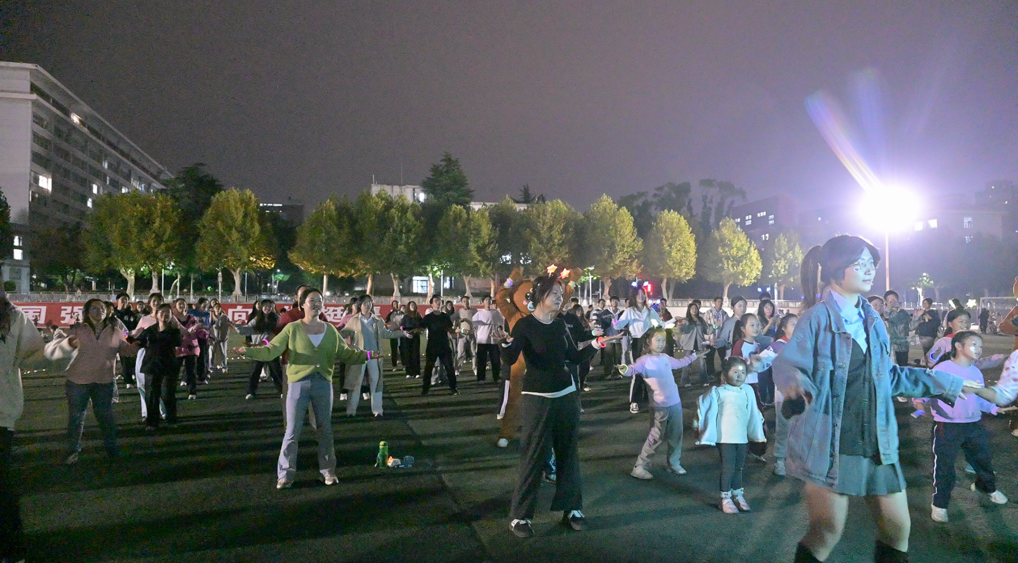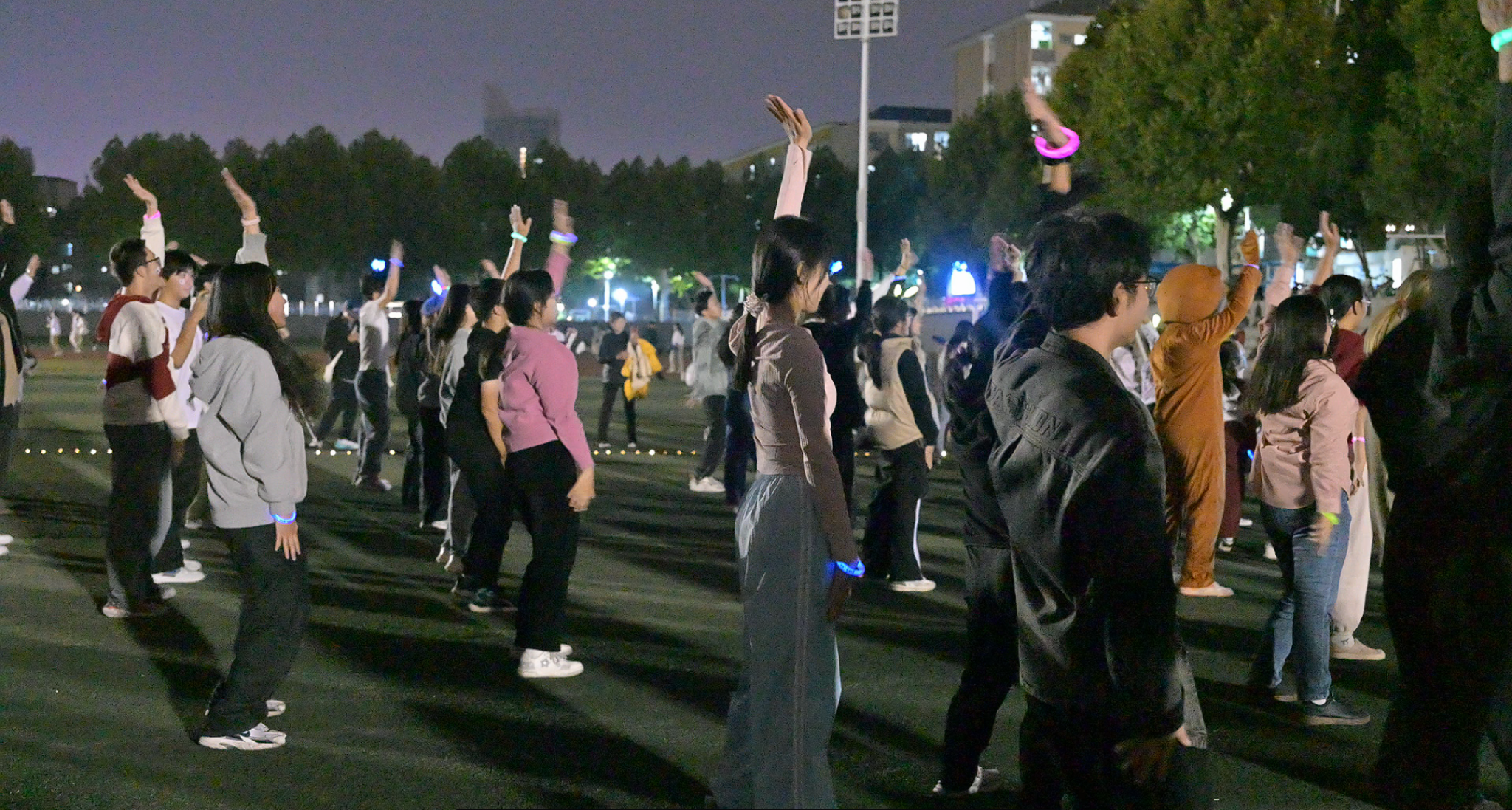19:00,随着主持人的一声令下,荧光夜跑正式启航。操场上,一条条荧光手环在夜色中闪烁,犹如点点繁星,照亮了青春的跑道。大家你追我赶,互相鼓励,共同完成了夜跑挑战。