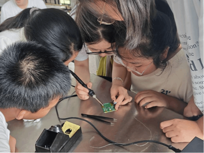 在支教队成员的分组指导下,孩子们亲手完成了电路板元件的焊接实践,操作3D打印机,制作出简易机器人模型,并体验了通过手机蓝牙远程操控机器人的乐趣。当孩子们看到3D打印机喷头来回移动,将融化的塑料层层堆叠成精巧的指尖陀螺时,孩子们无不屏息凝神,瞪大眼睛发出阵阵惊呼!科技的魔力深深震撼了每一颗幼小的心灵。