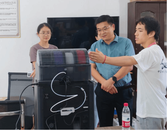 (队长刘文静向小悟乡党委书记徐宝传介绍3D打印技术)