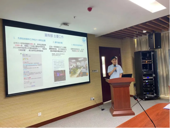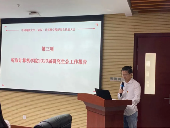 大会第二项,计算机学院研究生会主席团成员代刚做2020届研究生会工作报告,报告以《不忘初心,砥砺前行》为题,总结回顾了过去一年研究生会在思想引领、科创研学、素质拓展等方面展开的工作和取得的成效。