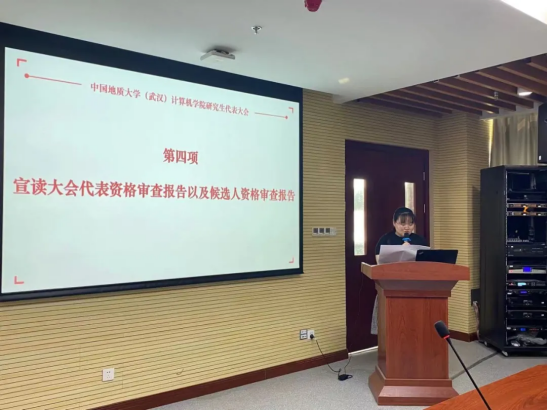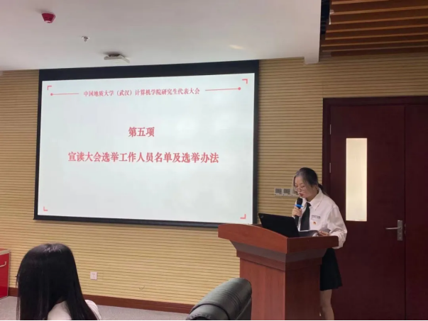 大会第四项,由计算机学院研代会筹备工作领导小组成员卢清华宣读《中国地质大学(武汉)计算机学院研究生代表大会工作人员名单》和《中国地质大学(武汉)计算机学院研究生代表大会选举办法》,本次大会采用无记名投票方式,选举设监票人1名,计票人1名及计时员1名。候选人答辩形式为“5+3”,即5分钟答辩,3分钟提问。正式代表对选票中候选人投赞成票,每张选票对候选人表示赞成的人数等于或少于5的为有效票。