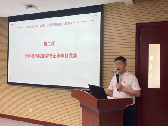 大会在雄壮的国歌声中拉开帷幕。会议伊始,计算机学院党委书记李国昌致辞。他指出研究生是学院科学研究、科技创新、学科发展的主力军,是院风学风的重要塑造者,而团委和研究生会是研究生自我管理、自我教育、自我服务的重要组织,能否发挥研究生科学研究、科技创新、学科发展主力军作用,浓厚院风学风,关键看团学骨干。对此,他希望团学骨干们要不断提高政治站位,坚定理想信念;要努力提供一流服务,围绕研究生成长和学院发展实际开展今后的工作;要对标一流,加强与兄弟学院、兄弟高校的交流,取长补短;要坚持团结,相互包容欣赏,心往一处想,劲往一处使;要严格自律,学会在大家的监督下工作,迎难直上,再创新高。