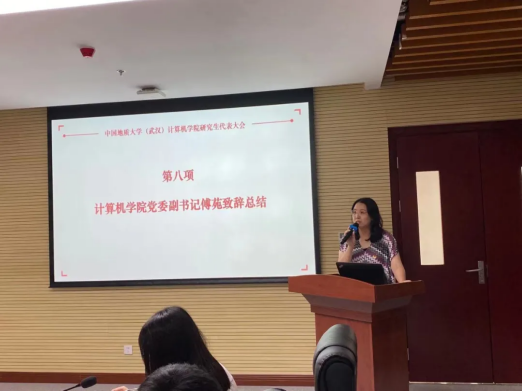 会议最后,计算机学院党委副书记傅苑总结讲话。她首先对各位竞选候选人的答辩表示肯定,高度评价各位候选人的参选勇气和答辩表现,希望大家将此次竞选作为研究生阶段学习、成长的一次成功起跑,在不断突破自我的过程中,提升综合能力和眼界格局;其次,她对参会的各位嘉宾、所有研究生代表和组织本次会议的研代会筹备工作领导小组成员表示感谢;最后,她对新一届团委副书记及主席团成员提出未来工作期望,希望大家致力于服务同学成长成才、维护同学切身利益,带领同学努力成为品德高尚、基础厚实、专业精深、知行合一的地大人,延续计算机学院研究生会的优秀传统,同时不断谋求改革创新,为服务学院建设发展和广大研究生的成长成才接续奋斗。