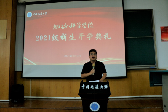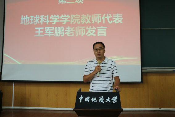 x11211班班主任王军鹏老师代表学院教师向新生表达了欢迎与期待,他将自己在地学院的15年经历分享给同学们,希望同学们学会做人、学会学习、学会做事,努力追求卓越,探索地球科学的奥秘。