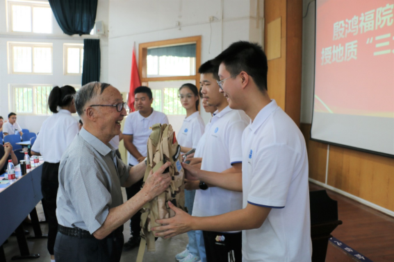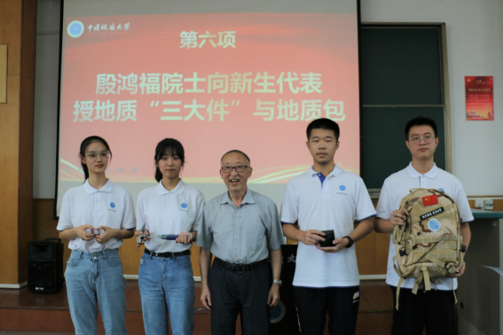 殷鸿福院士向新生代表授地质“三大件”与地质包