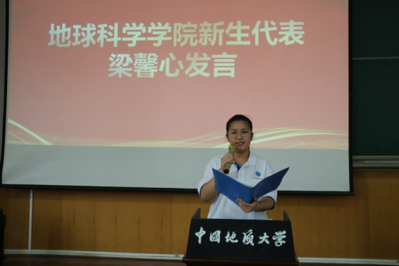 01021班梁馨心同学代表新生与同学们分享了自己对未来生活的期待。她表示,大学的生活应是充实精彩的,应沉浸在生动的课业和丰富的书籍中,一点一滴地积累,一步一步地求知,在地大为青春涂上应有的光彩,艰苦中奋斗前行,真知中务实探索,这样的青春才是美丽的。