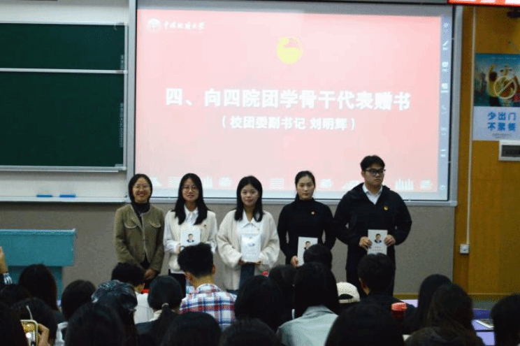 刘明辉为四个学院团学骨干代表赠书。