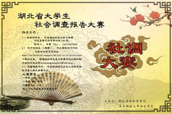 为深入贯彻落实习近平总书记系列重要讲话和党中央、湖北省委有关指示精神,适应大学生全面发展的新形势,进一步提高我省大学生的社会调查水平和成果转化能力,省社会学学会决定自2014年起,面向湖北省内各高校在校大学生开展湖北省社会调查报告大赛。本届大赛由湖北省社会学学会和华中科技大学社会学系共同主办。