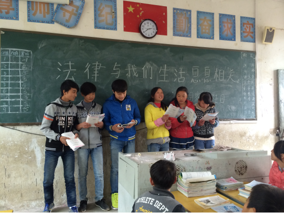 利用班会时间,组织学生开展以“法律与我们生活息息相关”为主题的普法活动。首先支教团成员进行了有关宪法知识的宣讲,让学生们了解《宪法》的基本知识;在互动环节里,让学生以小组为单位讨论与生活息息相关的法律知识;在小组展示环节里,每一组选出一位代表与大家分享本组成员的讨论结果;最后,学生们齐声朗读《思想品德》书中有关《中华人民共和国宪法》的介绍,本次活动在学生们朗朗的读书声中结束。