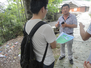 兴安村是百福司镇的一个偏远土家族小村,乘车过程中沿途可见新栽的行道树、退耕还林的茶柚林、西瓜地等等。到了兴安村之后,队员们直接被这里的吊脚楼、竹林吸引了,在司机的带领下,我们进竹林、走石阶、看小楼,来了一次免费的土家族小观光。不一会,村委书记彭南清来了,在我们说明来意后,彭书记热情地招待了我们,彭书记还告诉我们兴安村是来风县发展民族文化的示范村,该村自2008年开始进行天保工程以来,全村百分之八十的农户已放弃了烧柴的旧俗,转为沼气燃料。并且村里土地扭转决议已经下发到户,计划