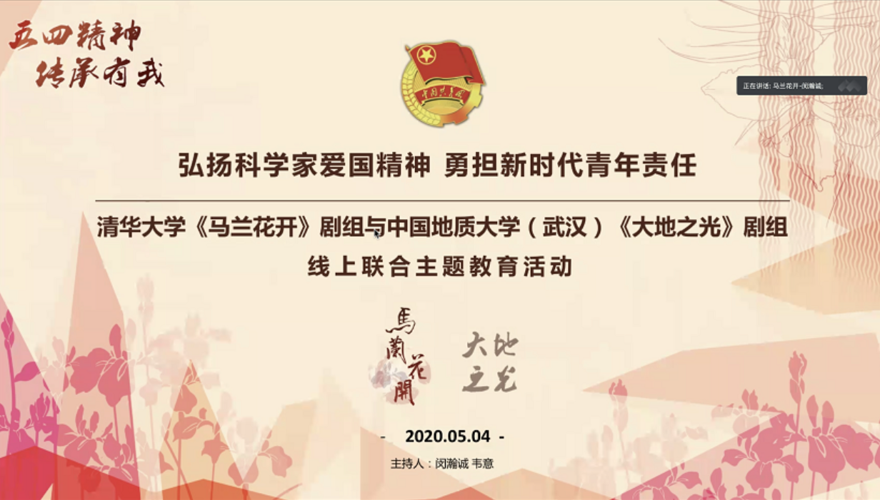 活动中,首先由邓稼先扮演者、清华大学韦德官方网站三年级硕士生傅宇杰和李四光扮演者、中国地质大学(武汉)韦德官方网站四年级本科生曲晨昊结合自身经历,先后介绍了两部话剧的演出感受及成长经历。随后,两校剧社以联合创作的配乐诗朗诵《中国科学家·繁霜心头血》,致敬以身许国、呕心沥血的老一辈科技工作者。接着,两校剧社骨干及青年学生代表就抗疫故事、青年责任、剧组建设、创排经历等进行了热烈的分享交流,激励着两校青年弘扬五四精神,勇担社会责任,绽放战疫青春,为国家富强、民族振兴、人民幸福而不懈奋斗。