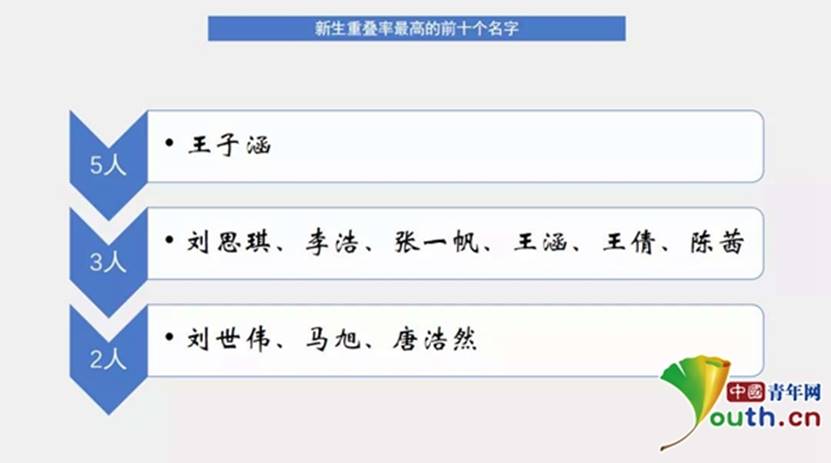 大数据还对新生姓名的重叠率做了统计,该校今年共招了5名“王子涵”,叫“刘思琪”、“刘浩”、“张一帆”、“王涵”的同学各3名等。其中一名王子涵向中国青年网记者谈起重名事情时说表示:“重名是件较为尴尬且有趣的事情,之前我也遇到过很多与自己重名的。”据他回忆,高中时期,他还与一位“王子涵”做过同桌。