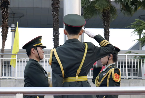 “我们日常训练会把旗手队员和队列队员分开训练,训练内容各有侧重。队列队员一般是加强正步训练,而我们旗手队员强调手部力量,则需要加强动作训练。所以我们旗手会进行俯卧撑训练,像我之前就需要进行45分钟长时间军姿,有的时候还会用到5到6kg的哑铃进行挥臂训练。”尽管在提问前已做好心理准备,但我们还是为刘容睿描述的训练量感到心惊,“为了把训练时间和所有队员的课业时间尽量错开,早训定在早上6点,晚训安排在了所有同学都下课后的9点。入队第一天队长就和我们说,如果想让动作变得更好,你可以要求加训。当时我们十个队员每天都自发要求加训一小时。虽然训练的时候很累,但是出任务的时候真的很光荣。看着鲜艳的国旗在你手中升起,这种感觉真的没办法形容。”