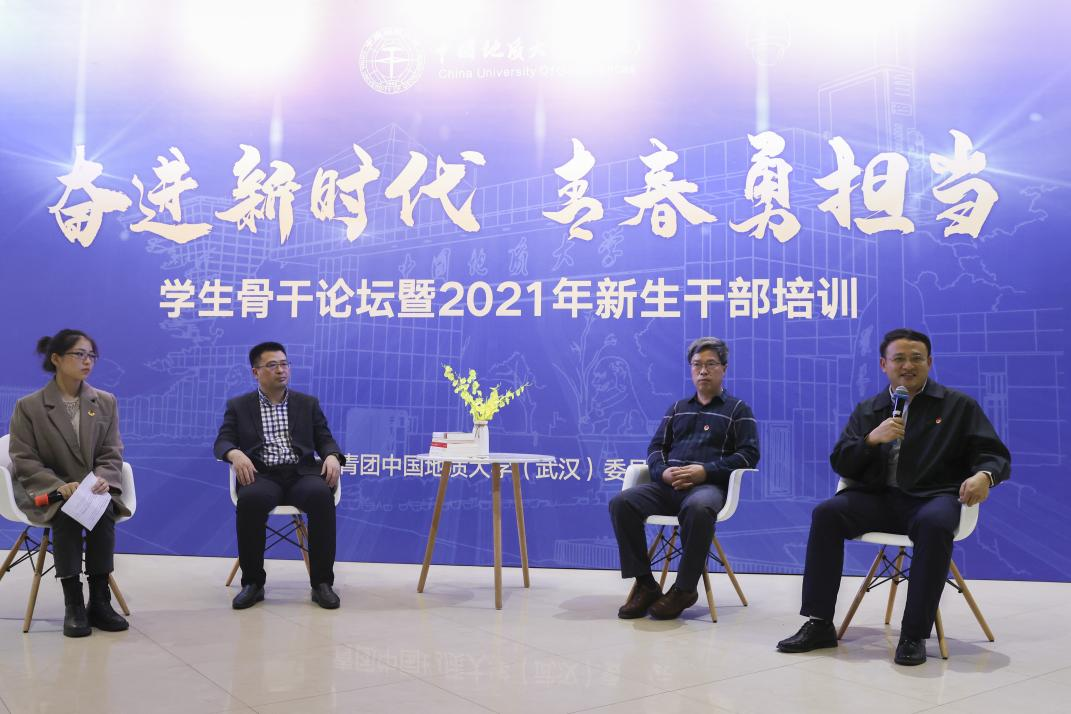 随后,与会领导嘉宾与学员进行了交流。同学们积极提问,嘉宾们热情回应,现场气氛十分热烈。邬海峰针对新生干部提出的“学校成立本科生院为学生成长提供了哪些有利条件”的问题进行了解答。他表示,学校成立本科生院顺应了当前国家建设一流本科教育的战略目标,优化了教书育人的协同管理机制,是构建教育教学深度融合、一体化的人才培养体系的重要举措。有新生干部想了解今年培训方案中新加入的“大学生涯规划”团体辅导课程的设置意义。沈波表示,以“大学生涯规划”为主题的团体辅导能够帮助同学们唤醒生涯发展意识,培养自我生涯规划能力,树立正确的生涯发展观,从而达到学以致用的目的。面对“什么样的学生干部才能称得上优秀的学生干部?”的提问,王华跟同学们分享了自己的看法。他认为,优秀的学生干部就是一面旗帜,任何时候都能汇聚人心,凝聚力量,能源源不断传递正能量,带领同学们一起向远看、向前走。