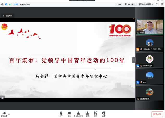 为深入学习贯彻习近平总书记在庆祝中国共产主义青年团成立100周年大会上的重要讲话精神,引导青年团干加强政治bevictor伟德官网,提高政治理论素养,5月19日下午,中国地质大学(武汉)组织开展第一期“青春心向党 建功新时代”红五月专题团课。共青团中央中国青少年研究中心助理研究员、北京师范大学政治学博士马金祥受邀专题授课。学校各二级团组织负责人、校院两级“青马工程”学员近百人参与线上学习。