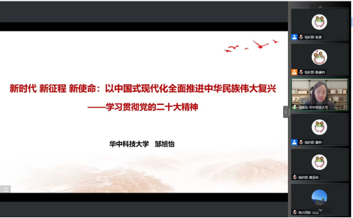 邹旭怡以《新时代 新征程 新使命:以中国式现代化全面推进中华民族伟大复兴》为题,从“深刻领会开辟马克思主义中国化时代化新境界”“以中国式现代化全面推进中华民族伟大复兴”“团结奋斗、谱写新时代中国特色社会主义新篇章”三个方面对党的二十大精神进行了全面宣讲和深入阐释。她号召青年学子深刻领会新时代新征程中国共产党的使命任务,为谱写新时代中国特色社会主义新篇章贡献青春力量。