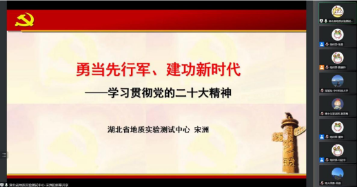 宋洲以《勇当先行军、建功新时代》为题,从“新时代新征程党的中心任务”“中国式现代化的关键”“湖北的创新使命”“湖北青年的创新实践”四个方面展开宣讲。他分享了自己带领团队以技术创新为突破口开展战略性矿产资源分析检测研究的工作经历,勉励青年学子将“请党放心,强国有我”的青春誓言融于为实现中华民族伟大复兴中国梦的无悔奋斗当中。