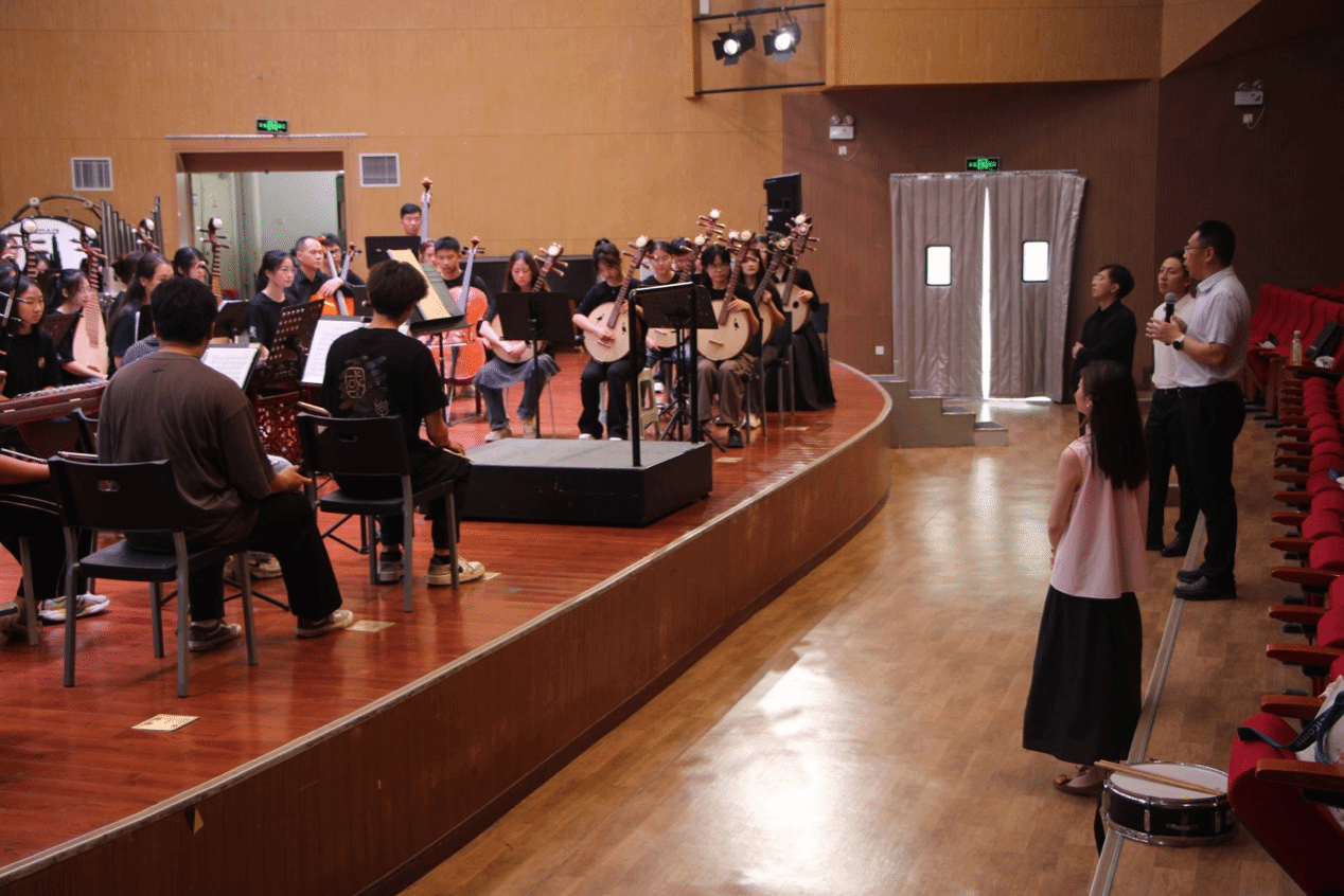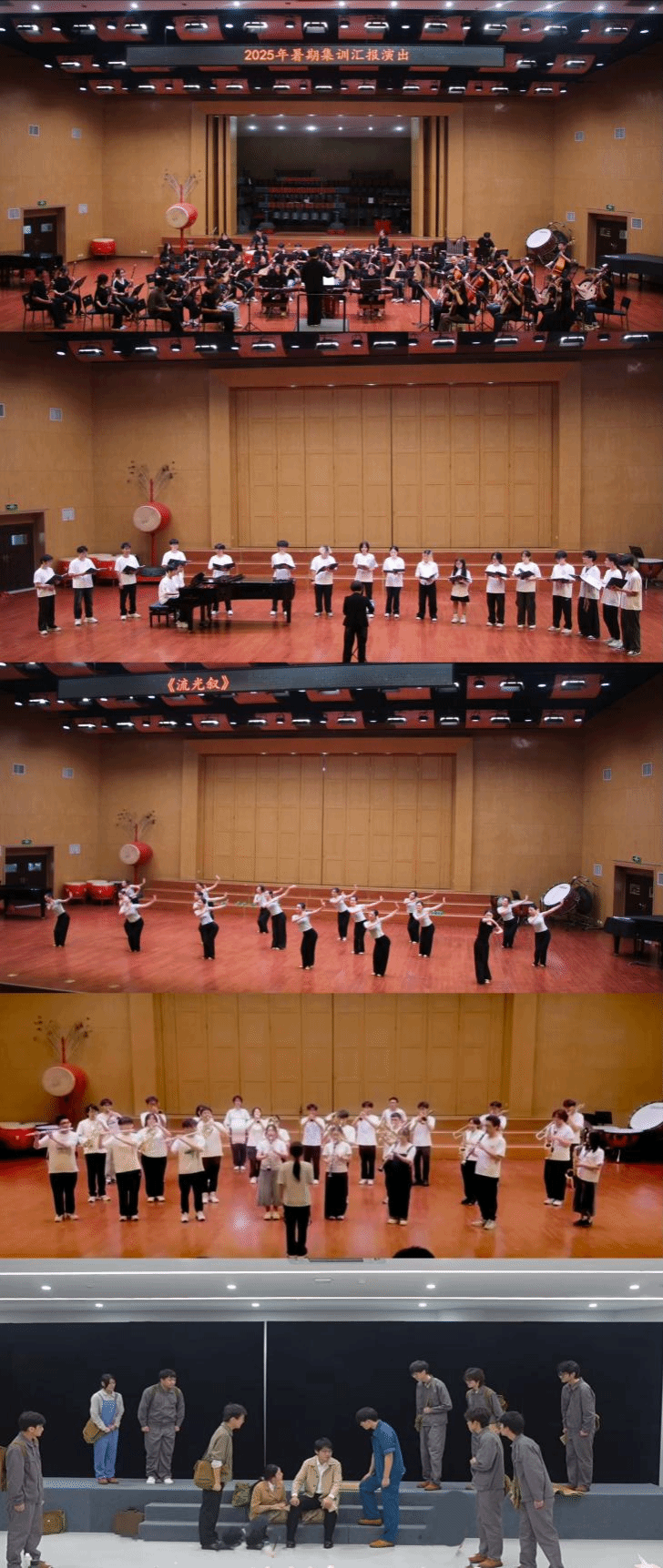 随后,集训团队分别在北区音乐厅和大学生活动中心展示了20天集训的部分成果。编钟国乐团演奏了气势恢宏的《我的祖国》与古韵悠扬的《玄鸟》。军乐团以嘹亮号角奏响《歌唱祖国》、《国歌》、《中国人民解放军进行曲》三首经典曲目。合唱团以清澈和声演唱响了《木棉道》《雪花的快乐》《小溪》,舞蹈团的《流光叙》《雨涧春行图》《只此青绿》则以曼妙舞姿演绎东方美学意蕴。子非鱼戏剧社负责排演的话剧《大地之光》进行了联排,新一代演员们在剧场内深情诠释李四光先生的光辉事迹与家国情怀。